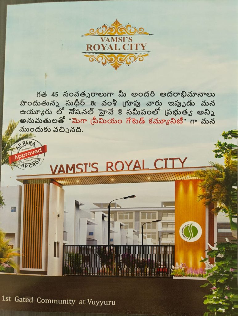 నమ్మకానికి పెట్టింది పేరు.. గడిచిన నాలుగున్నర దశాబ్దాలుగా కస్టమర్ల అభిమానాన్ని చూరగొన్న సుధీర్ అండ్ వంశీ గ్రూప్ రియల్ ఎస్టేట్ రంగంలో తనకంటూ ప్రత్యేకమైన గుర్తింపు సాధించింది. ఇపుడు ఉయ్యూరులో వంశీ రాయల్ సిటీ పేరుతో ముందుకొచ్చింది. ఉయ్యూరులో మొట్టమొదట మెగా ప్రీమియం గేటెడ్ కమ్యూనిటీకి శ్రీకారం చుట్టింది. 35 ఎకరాల విశాల విస్తీర్ణంలో ఓపెన్ ప్లాట్లు, విల్లాలతో ఆహ్లాదపరిచే వాతావరణంలో శరవేగంగా నిర్మాణ పనులు చేపడుతోంది. ప్రపోజడ్ (ప్రతిపాదిత) అమరావతి రింగ్ రోడ్డుకు కేవలం అయిదు నిముషాల వ్యవధిలో చేరుకునేలా, విజయవాడ-బందరు ప్రధాన రహదారిని ఆనుకుని నిర్మిస్తున్న వెంచర్ పట్ల కస్టమర్లు అత్యంత ఆసక్తి కనబరుస్తున్నారు. ఇప్పటికే విల్లాలు దాదాపు అమ్ముడవుగా కొద్దిపాటి ఓపెన్ ప్లాట్లు అమ్మకానికి సిద్దంగా ఉన్నాయి. సీఆర్ డీఏ (CRDA), ఏపీ రెరా (AP RERA) అప్రూవుడ్ తో, సువిశాలమైన 40 అడుగుల రోడ్లతో పాటు డ్రైనేజీ, విద్యుత్, వాటర్ ట్యాంకు, ప్రతి ప్లాటుకు మంచినీటి కొళాయి కనెక్షన్ కూడా అందిస్తున్నారు.